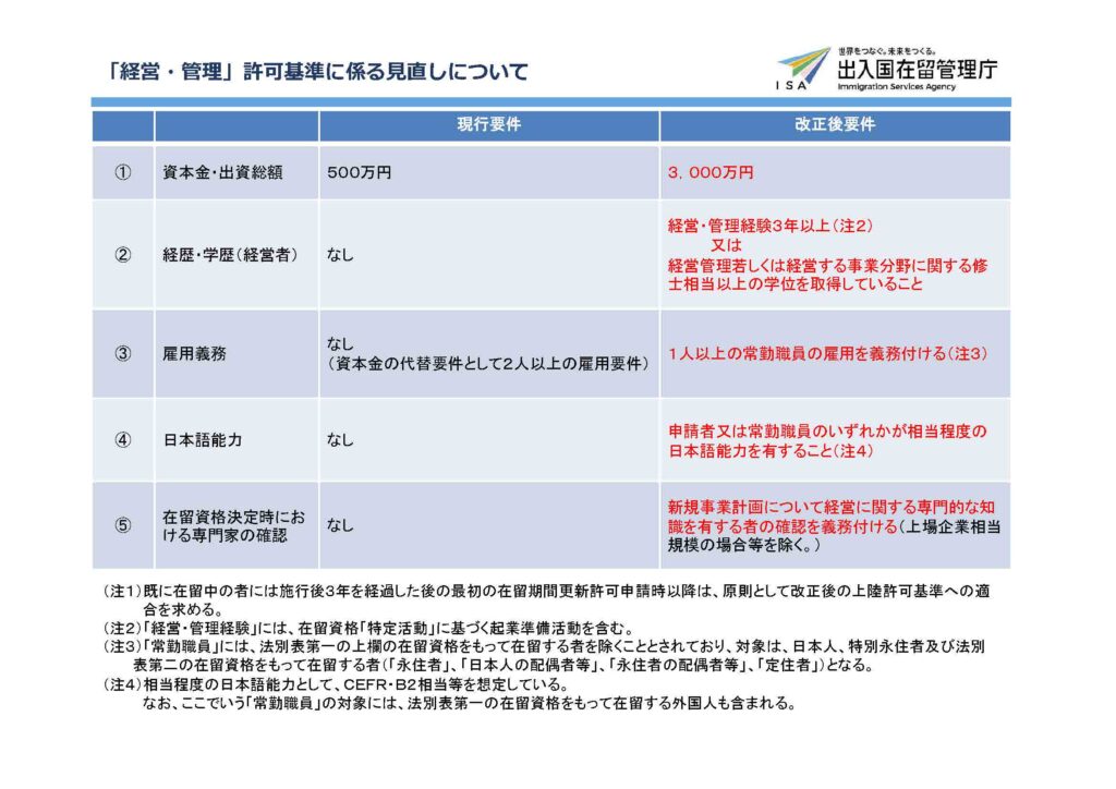 若未符合修订后的许可标准,则不会核发「经营管理」、「高度专门职1号八」或「高度专门职2号」(均以「经营管理」活动为前提)的永久居留许可。同样地,亦不会批准由「高度专门职1号八」转为「高度专门职2号」的在留资格变更申请。
