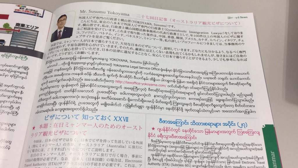 行政書士 横山 晋は、在日ミャンマー人及びミャンマーに関係する日本人向けのフリーペーパー(月刊情報誌)