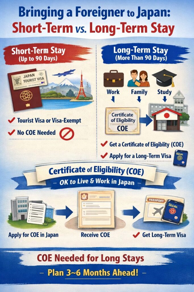 想邀請外國人來日本,第一個必須確認的重點是:停留時間是短期,還是長期?這個判斷,將直接影響簽證種類與申請流程。